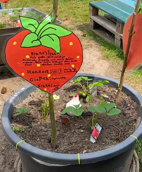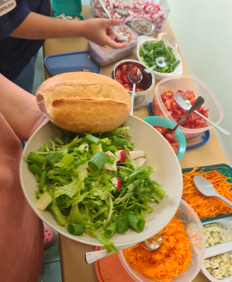 Bewusstmachen, dass wir zum Spielen, Lernen und Wachsen Energie benötigen, die aus gesunder Nahrung aufgenommen werden kann, ist das Ziel unseres regelmäßig durchgeführten Kochkurses im Jahrgang 3 und 4. Der Umgang mit der eigenen Gesundheit und dem eigenen Körper stehen dabei im Vordergrund. Gesunde Energielieferanten werden kennengelernt, Begriffe erklärt: Vitamine, Kohlenhydrate, Fette und Zucker. Gemeinsames Kochen im Rahmen des AID-Ernährungsführerscheins und gemeinsames Essen fördern das Zusammenleben und ein gesundes Essverhalten. Unterstützt wird das Projekt regelmäßig durch eine Ernährungswissenschaftlerin. Seit 2022 werden im Schulgarten eigenes Obst, Gemüse und Kräuter in kleinem Rahmen angebaut. Die Pflanzen werden in den Klassen vorgezogen, bei entsprechender Größe in Hochbeete nach draußen gepflanzt, beim Wachsen beobachtet und gepflegt. Nach abschließender gemeinsamer Ernte wird verzehrt und gemeinsam gekocht.